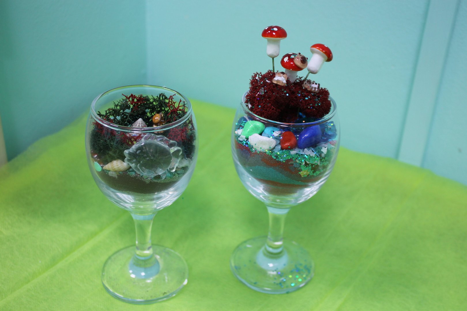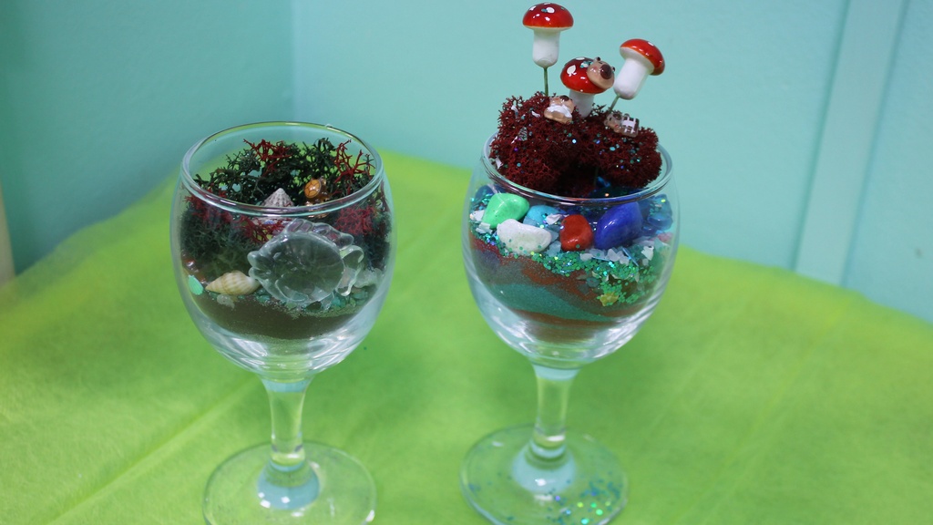 Декор: ракушки, камушки, стеклярусы, цветной песок и другое.