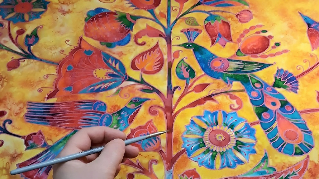 Под руководством известного московского художника по тканям Елены Клименко расписываем панно размером 65×65 см с готовым контурным рисунком в технике холодный батик.
