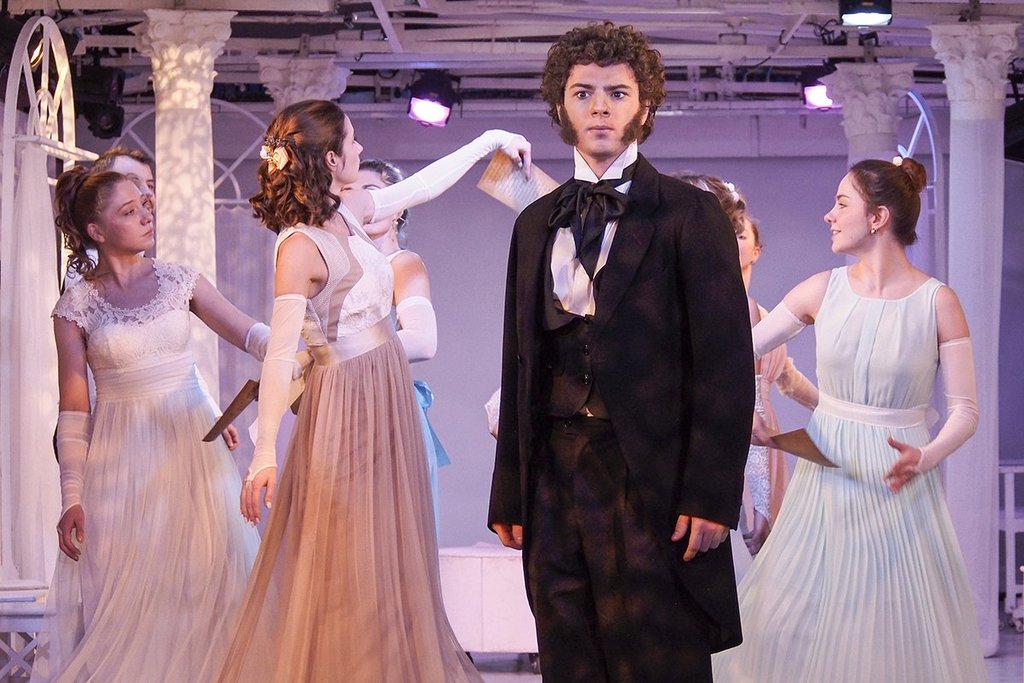 Речь идет о современном прочтении материала, а потому соединение в одном пространстве элегантных костюмов и воздушных платьев пушкинской поры с джинсами и футболками воспринимается как стилистически продуманный ход.