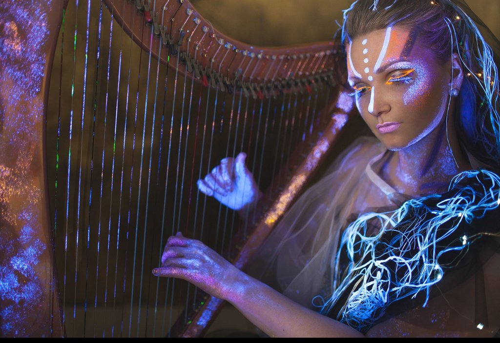 «Арфа в темноте» — уникальный перфоманс арфистки Ольги Максимовой. Медитативная музыка электроарфы сочетается с видеоинсталляцией, переходящей в полную темноту, из которой постепенно при помощи ультрафиолета и специального грима появляется образ арфистки.