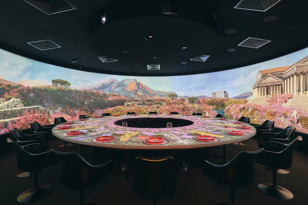 Зрители оказываются внутри большого главного зала гастрономического театра, где пространство полностью трансформируется благодаря проекционному 360° шоу. Истории семи чудес света разворачиваются вокруг гостей — на стенах и прямо на столе.