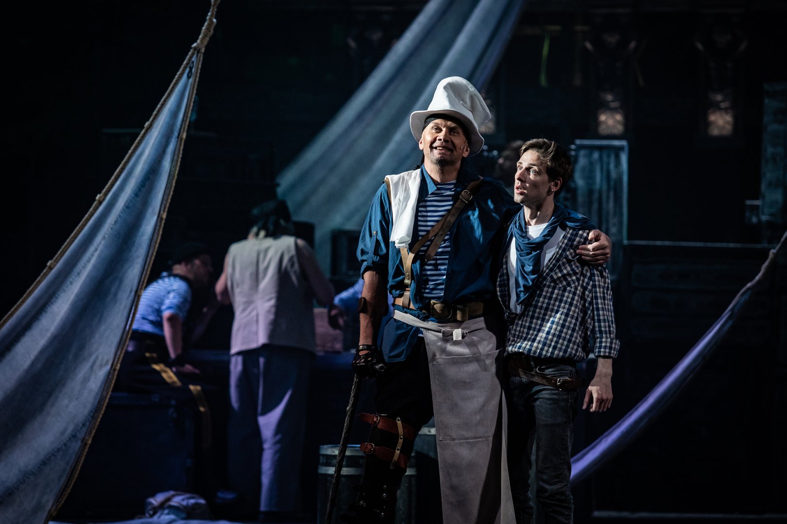 В прочтении режиссера Александра Коручекова всемирно известный приключенческий роман для детей становится «романом взросления» для подростков. Здесь мерцают в тумане белые паруса, сумрачное пространство корабельного трюма не дает поблажки ни слепым, ни одноногим, а сольные рок-баллады пиратов сменяются перестрелками и рукопашными боями.