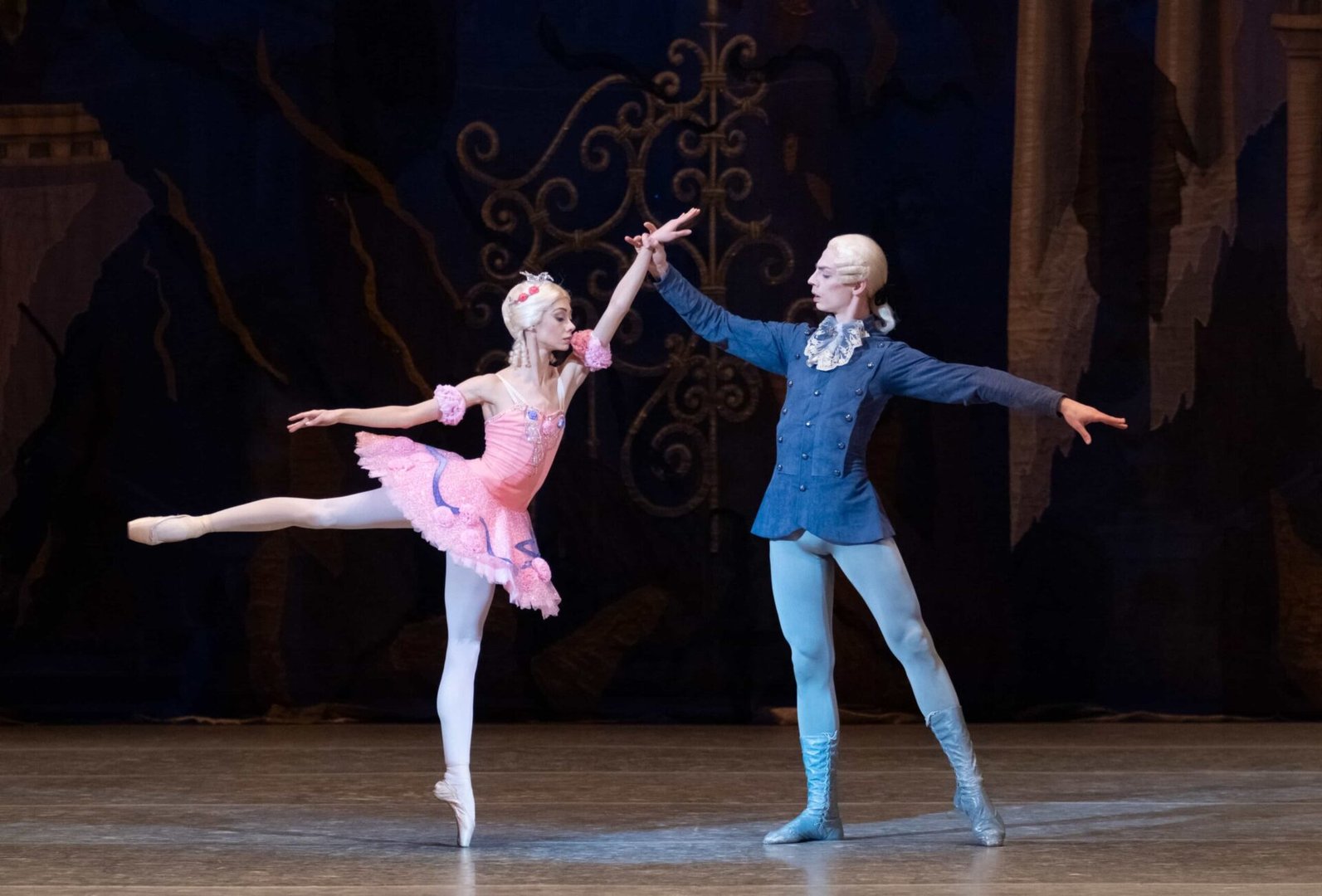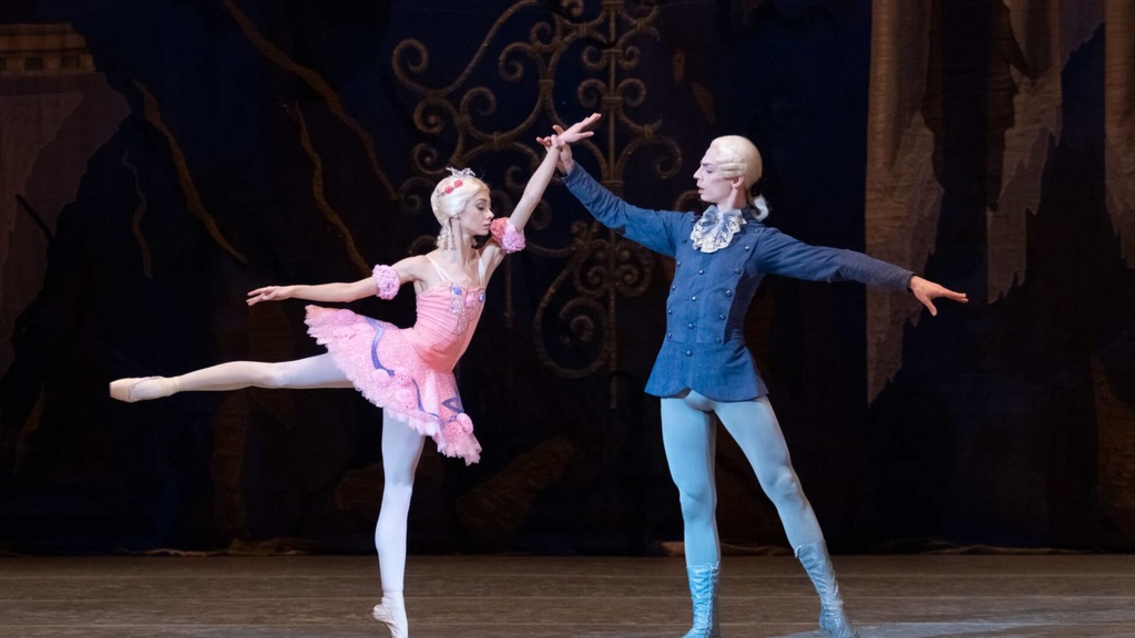 Парк при дворце Короля Флорестана. Авроре исполнилось двадцать лет. Ее руки добиваются многие знатные молодые люди. Появляются четыре принца — претенденты на руку Авроры. В окружении фрейлин к ним выходит принцесса Аврора. Король и королева предлагают своей дочери выбрать жениха. В разгар веселья появляется старуха и дарит принцессе букет цветов. Аврора танцует с букетом. Все замечают, что из букета принцесса достает обыкновенную вязальную спицу. Вдруг её танец прерывается: Аврора уколола палец и мечется в испуге. К ужасу присутствующих, она падает. Старуха, подарившая букет, сбрасывает плащ, и все узнают злую волшебницу Карабос. По знаку феи Сирени вслед за Авророй все погружаются в сон.