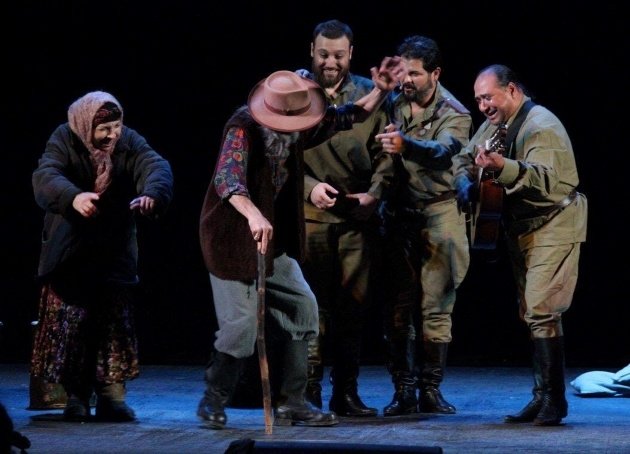 Конечно, здесь, как и должно быть в театре «Ромэн» много песен и танца. В оркестровой яме весь спектакль ведет гитара, ей же у костра вторит гитара солдата Матвея, который, стесняясь, говорит в начале, что за военные годы уже и забыл, как играть.