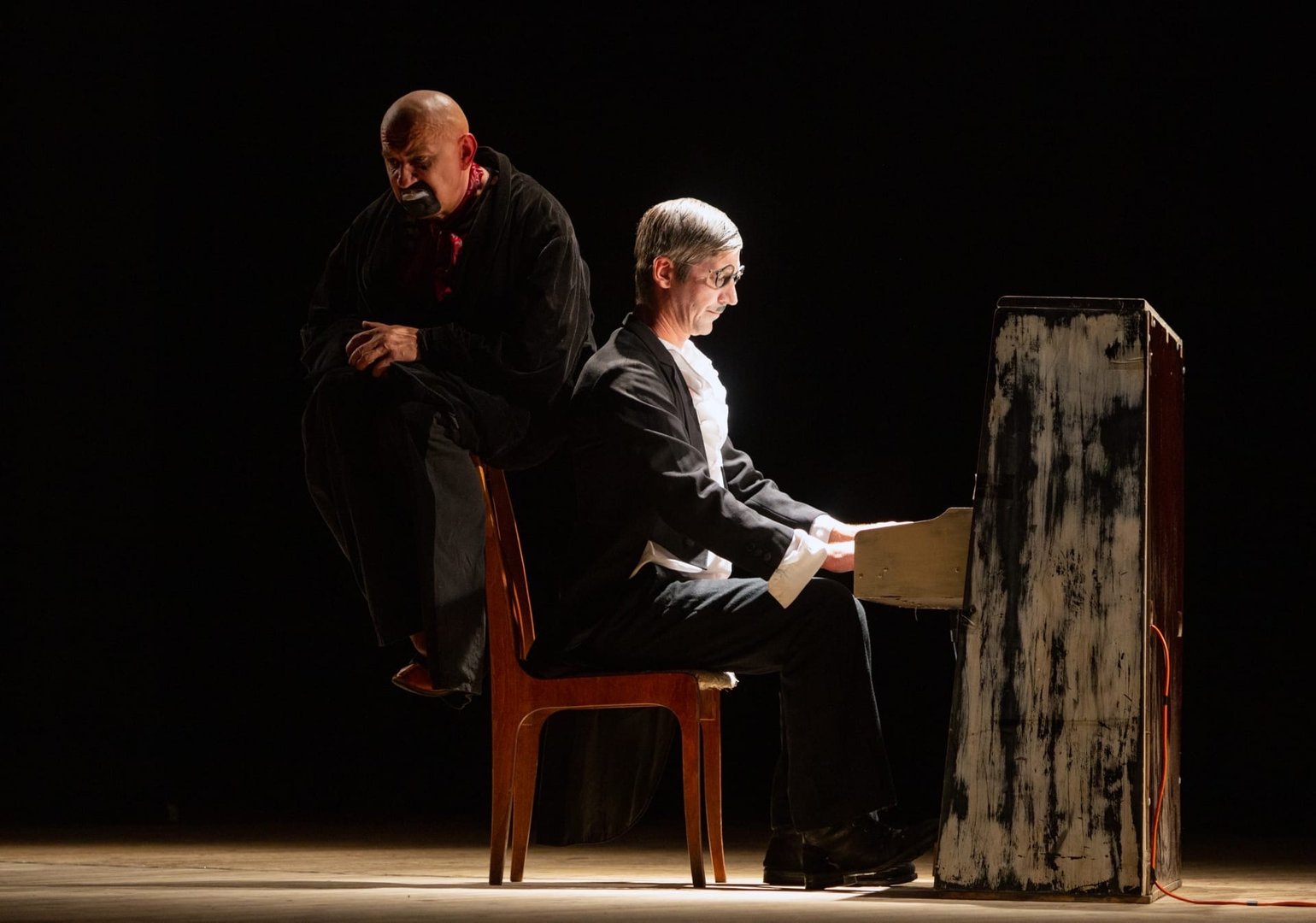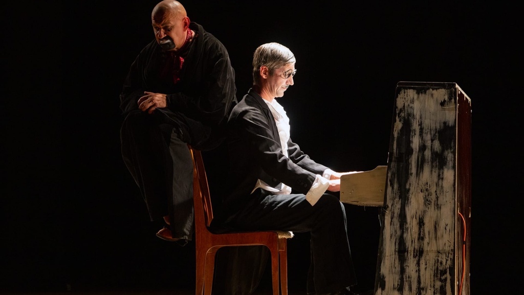 Слов у клоунов нет. Музыка — классическая. Сценография минималистичная — стулья, вешалка, пианино. Тема — жизнь души. Форма — эпизод из жизни. Трое непохожих друг на друга персонажа пытаются ужиться в едином пространстве. По-другому описать то, что происходит на сцене, невозможно. Надо видеть, что они делают. Предельная четкость абсурда. Эмоции без плюсов и минусов.