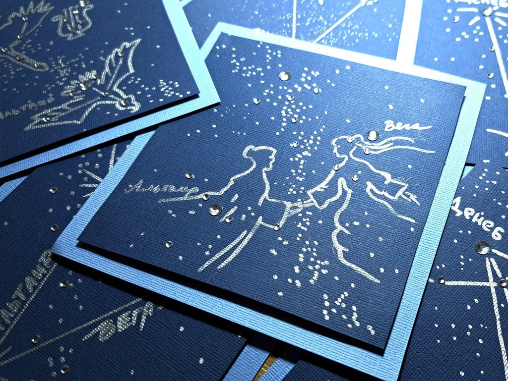 Зима. Редко-редко погода радует нас в это время ясными ночами... А мы воссоздаём мерцающие картины звёздного неба своими руками в уютном светлом зале! В работе используем красивую бумагу цвета ночного неба, разноцветные стразы, серебристыми маркерами обозначаем фигуры созвездий, их русские и латинские названия, яркие звёзды и интересные объекты.