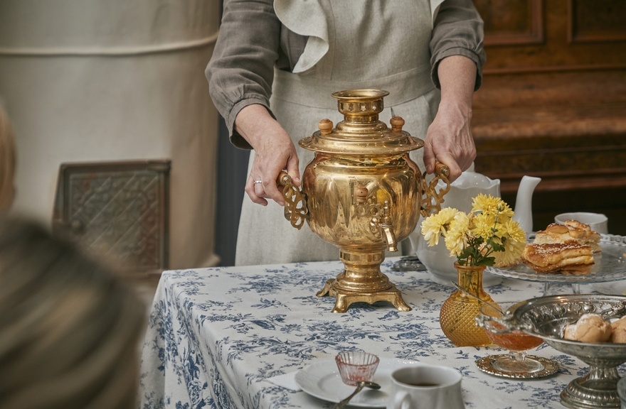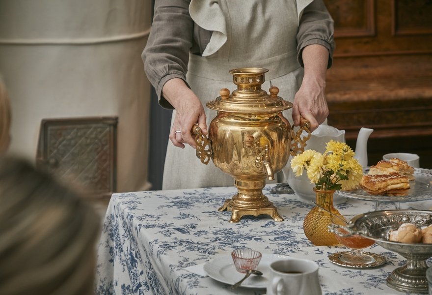 Старинная усадьба хранит особую атмосферу: потрескивают дрова, сияет начищенный самовар, а в просторной гостиной собираются гости. Здесь время течёт неспешно, и каждая деталь — от выбора дров до сервировки — становится частью истории.