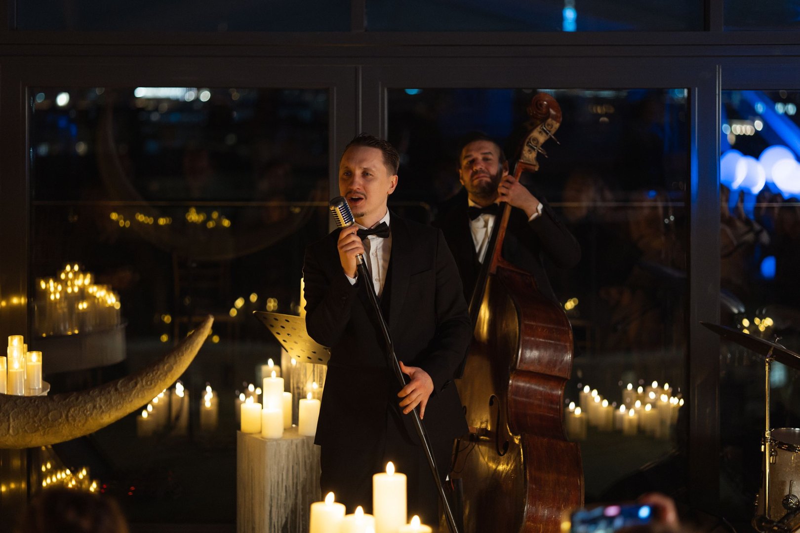 Это вечер, где всё складывается в идеальную атмосферу: мягкий свет свечей, панорама ночного города и музыка, которая заставляет сердце биться в ритме джаза.