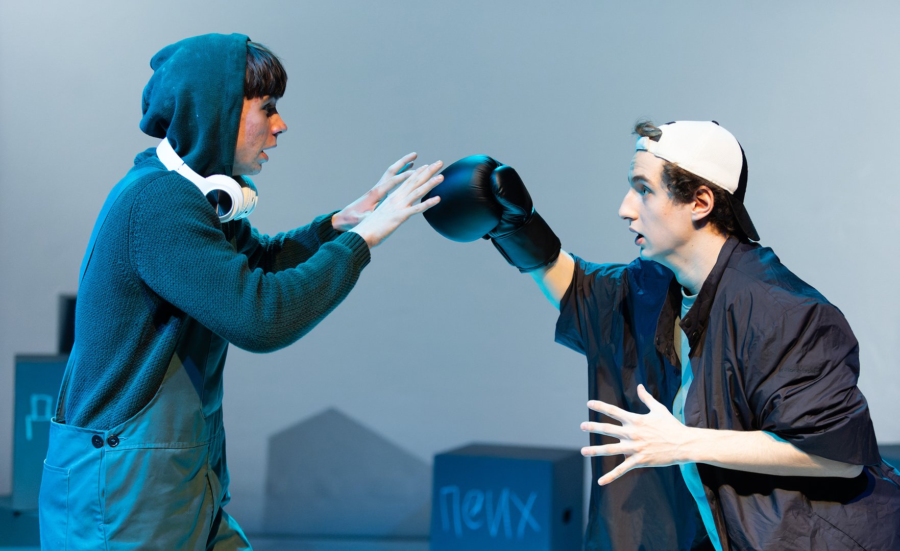 История в спектакле рассказывается «из головы» подростков, строится как поток их внутренних монологов, которые в какой-то момент сходятся в одной точке... И становится понятно, что не такие они и разные, эти ребята. Тем более, как говорит математик Лева, «в нулевой степени все люди одинаковые, равны единице».