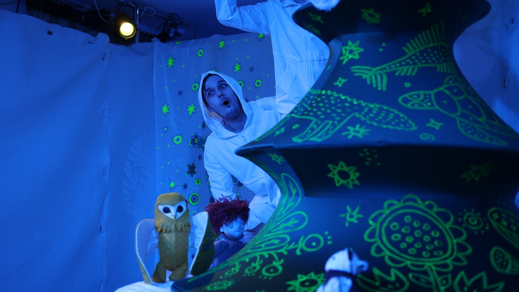 Маленькие зрители попадают на волшебную заснеженную полянку, где звучит удивительная музыка. На этой полянке и встречаются герои спектакля — Мышонок, Малыш и Совёнок. Они прыгают в сугробах, играют в снежки, наблюдают за подводными рыбами, катаются на коньках и летают на Совёнке. Особый интерактивный формат спектакля позволит детям не просто наблюдать за играми героев, но принимать в них непосредственное участие.