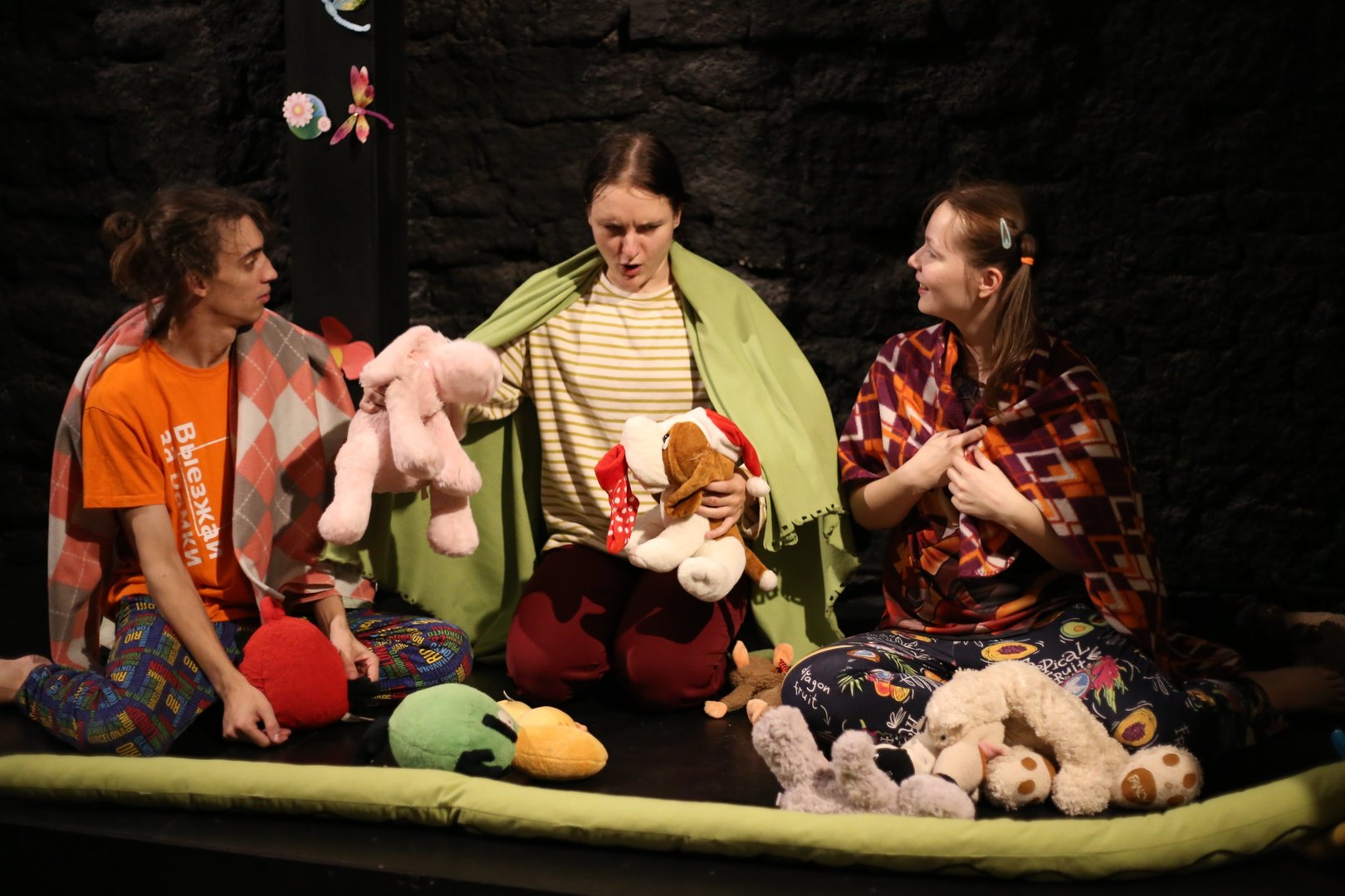 Так и происходит в спектакле, в основе сюжета которого — сказочные фантазии, которые сочиняют дети перед сном. Основные герои — две девочки и мальчик рассказывают забавные истории и сказки «оживают» прямо на глазах у юных зрителей, заставляя их переживать за маленького мышонка, болтливого короля и других героев спектакля.