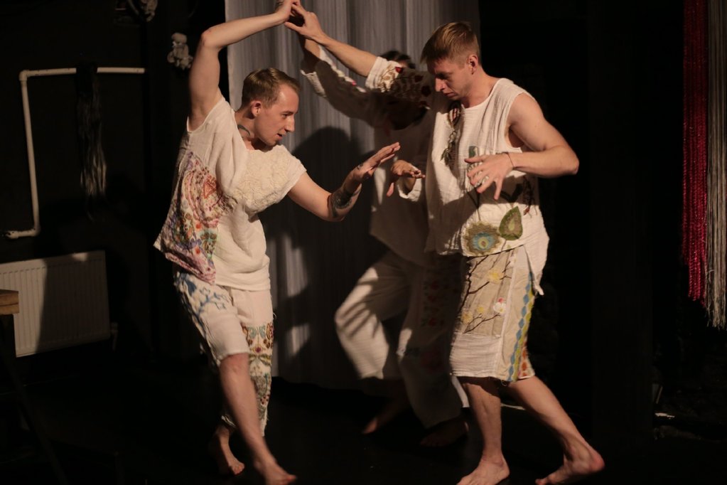 Спектакль поставлен с сильным акцентом на пластику — актёры почти ни на минуту не останавливают свой обрядовый танец. Трое скоморохов мгновенно перевоплощаются в различных персонажей, осмысляя образ каждого из них: от Бабы Яги, Жениха, Кривды с Правдой до обитателей сказочных миров.