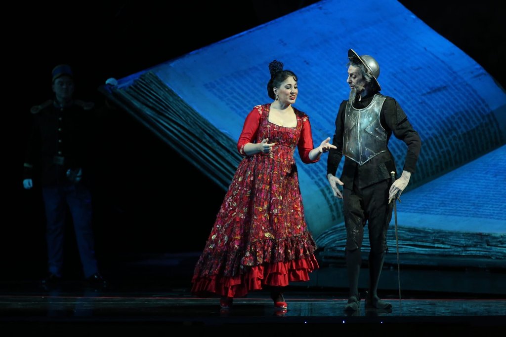 В мариинском «Дон Кихоте» три важнейшие линии — испанская, французская и русская — тонко переплетаются. Оперу поставил в 2012 году Яннис Коккос — французский режиссёр и сценограф греческого происхождения. Сценографической доминантой он сделал книгу: герои оперы буквально сходят с её страниц. Но этот фолиант — не только роман Сервантеса; книга становится символом идеального мира, в котором живёт чудачествующий старик Алонсо Кихано. Книги питают его воображение, вдохновляют на подвиги, заслоняют реальность до такой степени, что, по слову Тургенева, «самая несомненная вещественность исчезает перед его глазами, тает как воск от огня его энтузиазма». Исчезает словно в тумане, недаром Яннис Коккос заволакивает сцену сизоватой дымкой. Странствия рыцаря-фантазера постановщик назвал «путешествием без движения в едином пространстве», «вариациями сна». Призрачную атмосферу французского fin de siècle воссоздает театр теней: на театральном заднике проецируются силуэты всадников, один из которых — на коне, другой — на осле. Оказавшись на сцене — рядом с книгой, фигурки лошадки и ослика в соизмерении с ней кажутся оловянными сувенирами, а сам Дон Кихот напоминает популярную каслинскую статуэтку, восходящую, в свою очередь, к легендарному шаляпинскому прототипу.