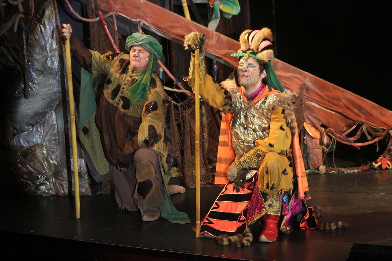 Не просто в сказочные джунгли приглашает вас театр «На Неве», а в восточную страну с ее экзотическим колоритом. Здесь у грозного Шерхана — роскошное военное платье и тюрбан, а его слуга Табаки облачен в отрепья бедуина. На шакалах коричневые шелка, лица их скрывает зеленая чадра, а каждый шаг сопровождается звоном монист. Слон Хатхи выступает, как вальяжный пузатый раджа, а танцующие со своими дивными хвостами-веерами павлины — завораживают.