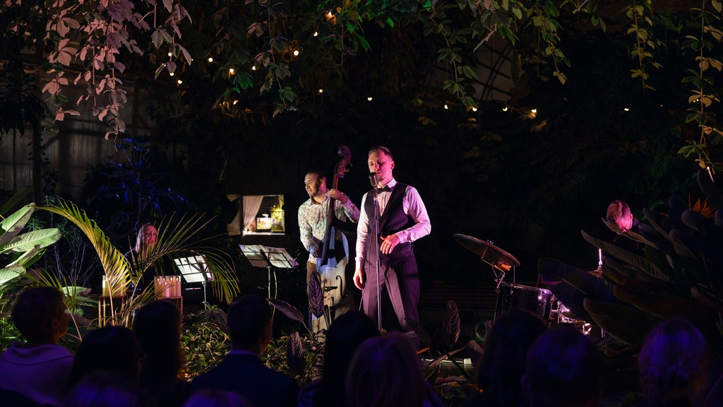 Среди сотен сияющих свечей и тропических растений высококлассный джаз-бэнд Jazz Hooligans исполнит любимые всеми песни Синатры: Let It Snow, Jingle Bells, Have Yourself a Merry Little Christmas и многое другое.