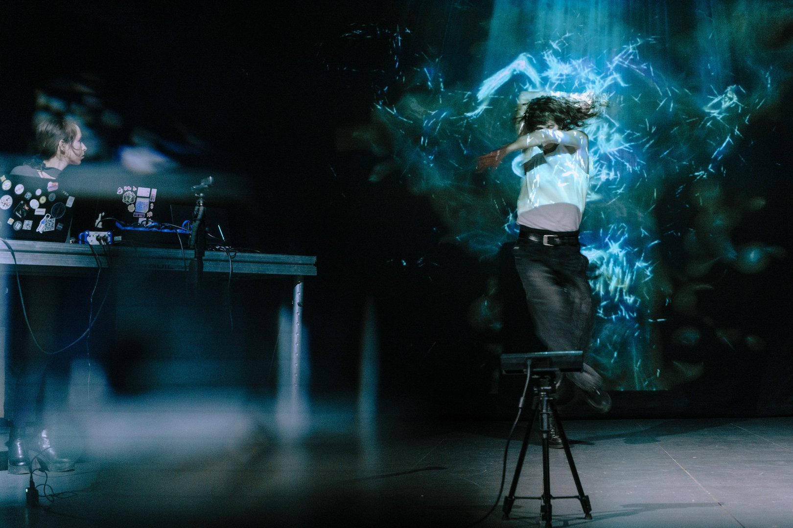 «Медиаплэйс» — это формат перформативных импровизаций, объединяющих звук, движение и цифровое искусство в интерактивном пространстве.